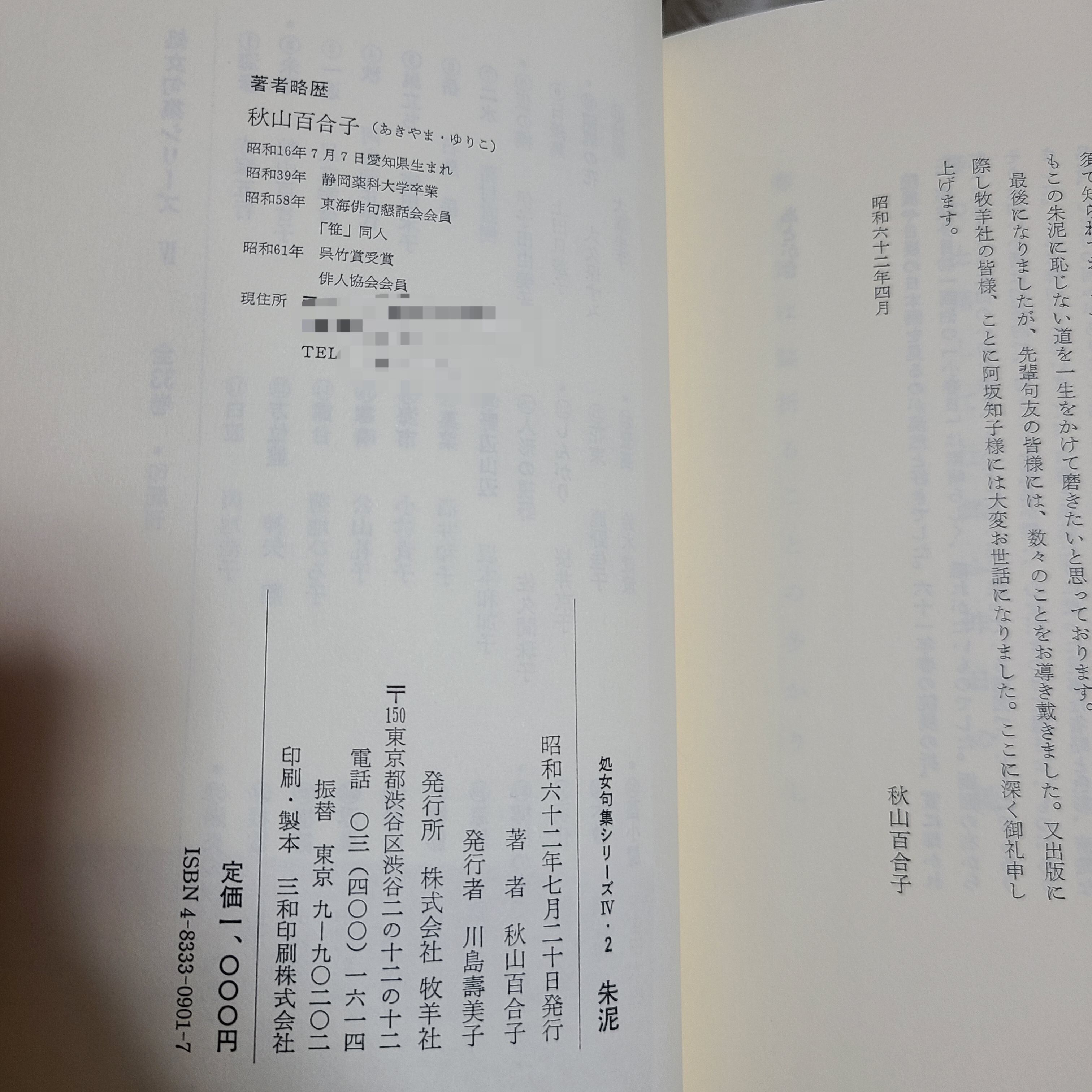 秋山百合子「朱泥 処女句集シリーズⅣ-2」(牧羊社、昭和62年)