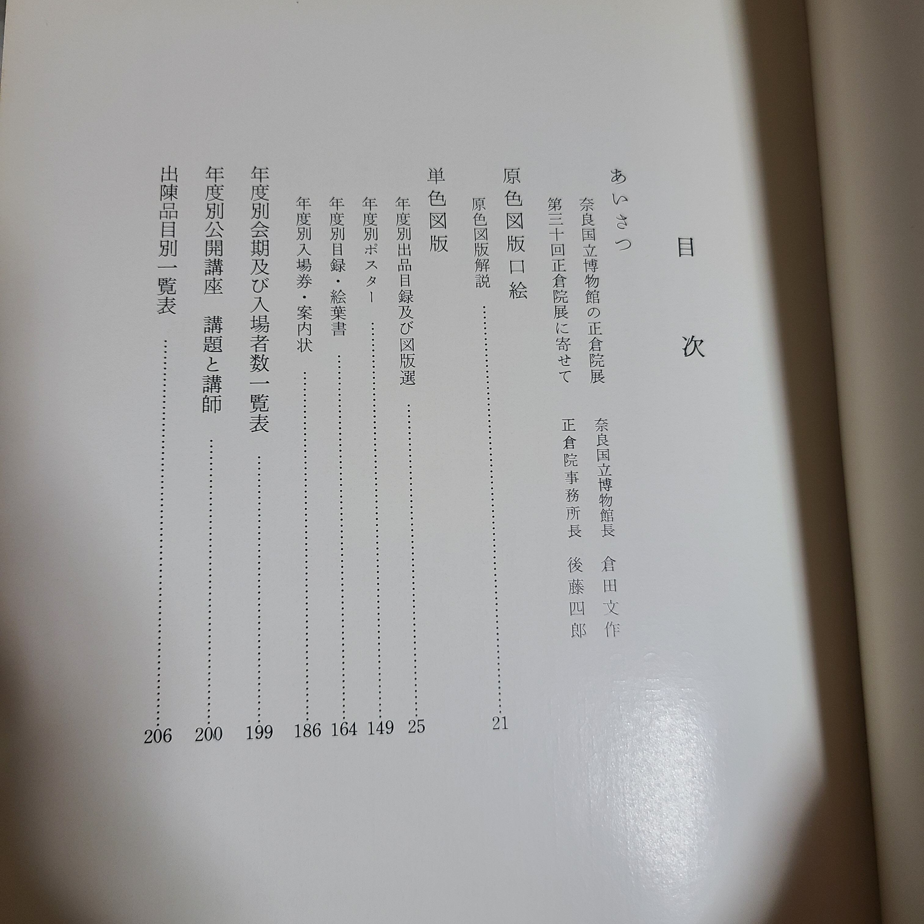 原色図版口絵、単色図版、年度別会期及び入場者数一覧表、年度別公開講座 講題と講師、出陳品目別一覧表