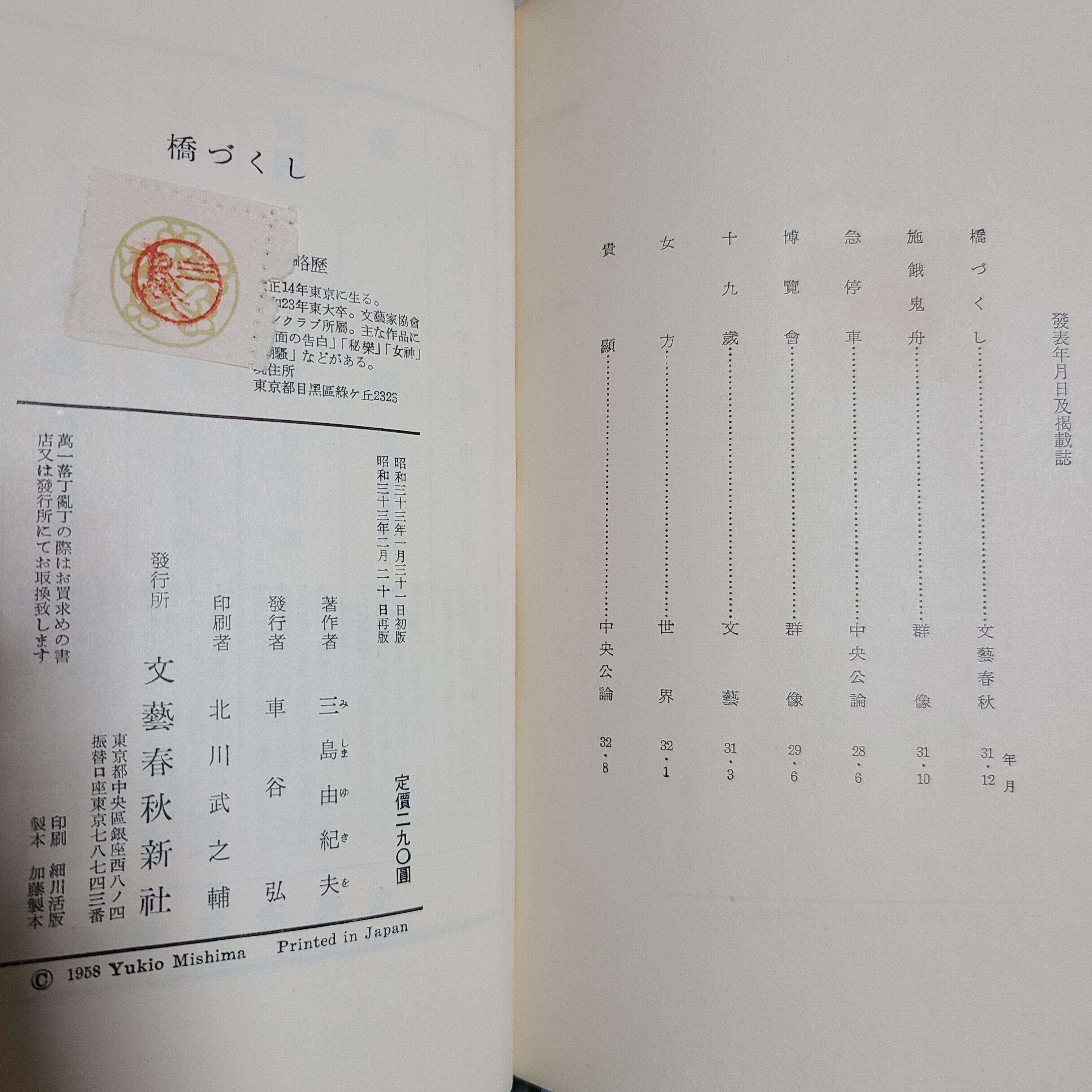 三島由紀夫「橋づくし」(文藝春秋新社、昭和33年)