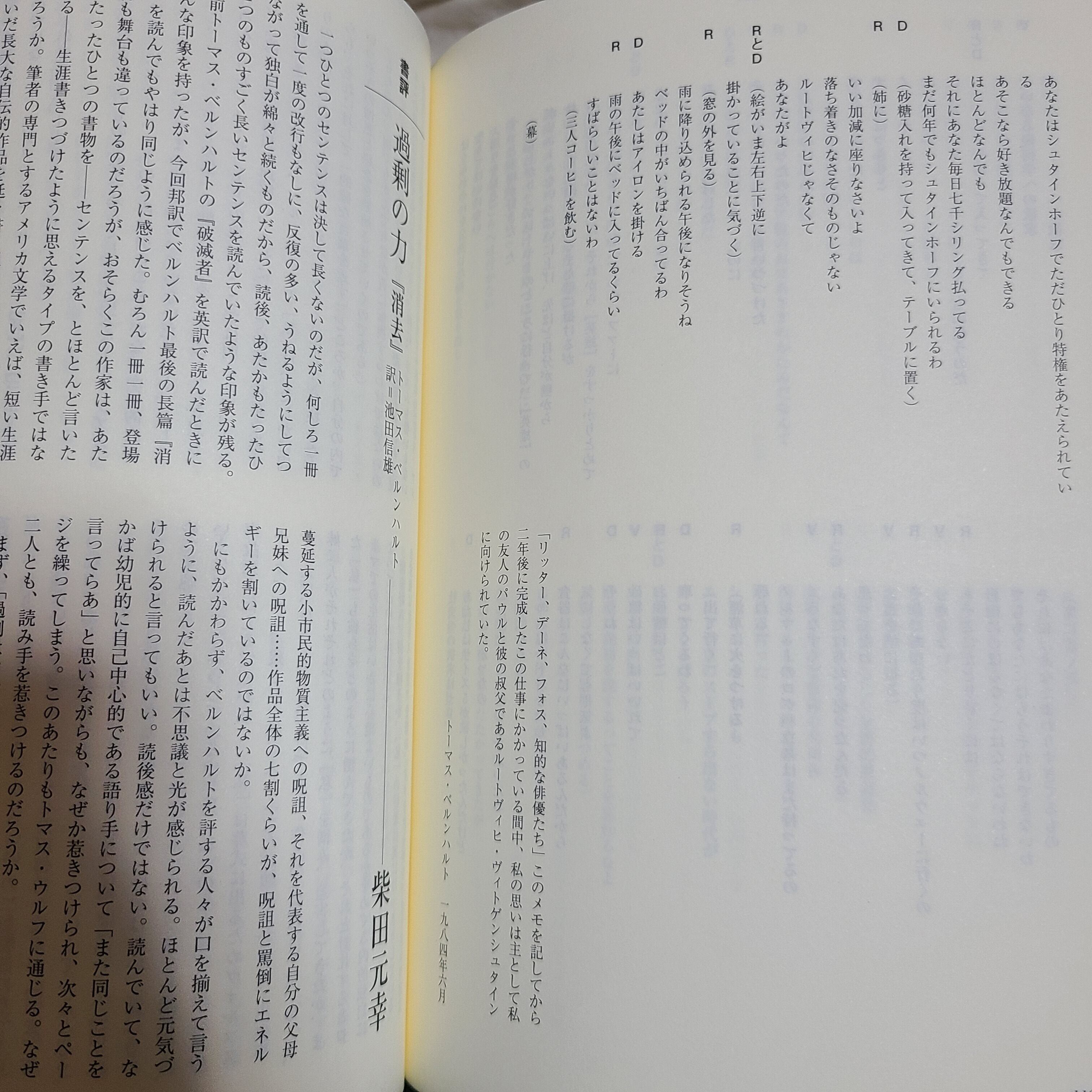 特集のことば(池田信雄)/短篇 雨傘(ベルンハルト)/詩 クリスティーネ・ラヴァントの十三の詩篇(ラヴァント)/戯曲 リッター、デーネ、フォス(ベルンハルト)/書評 過剰の力 『消去』(柴田元幸) ほか